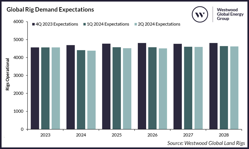 For 2024, Westwood predicts global rig demand at 4,384 rigs, down 1% from our 1Q 2024 outlook and 7% below our 4Q 2023 expectation due to the continued effect of stagnant oil prices and high service costs. US activity remained constrained in 2Q, but this is expected to be at, or near, the bottom point for activity, with rig demand expected to average around 3% higher through the second half of 2024 when compared to 1H. Beyond 2024, rig activity in the US, as well as other key areas for rig demand such as Russia, is forecast to remain well below historic levels. This will counterbalance strong growth in areas such as China and the Gulf Cooperation Council (GCC). Between 2025 and 2028, an average of 4,559 rigs are expected to be operational, slightly below the 4,595 rigs in our 1Q 2024 forecast.