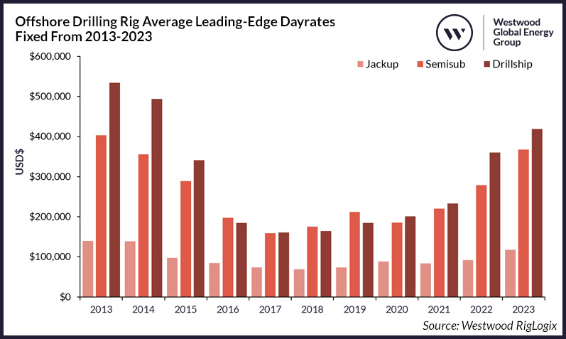 Offshore Drilling Rig Average Leading-Edge Dayrates Fixed From 2013-2023